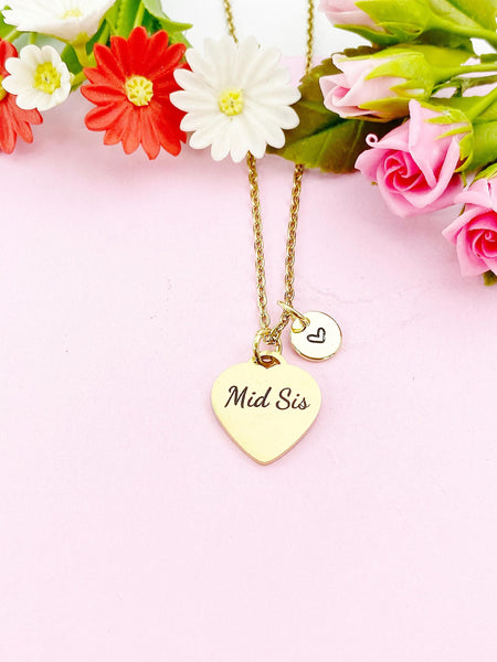 This is an engraving Mid sister on stainless steel with hand stamp Initial charm on stainless-steel chain.