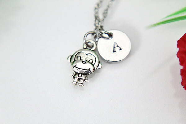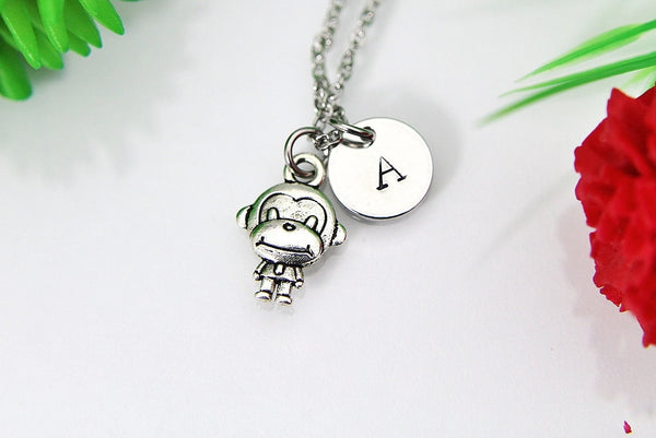 This is a silver-tone monkey charm with hand stamped initial charm on a chain. You able to choose initial from a drop-down menu. You able to choose as a necklace, bracelet bangle or key chain.