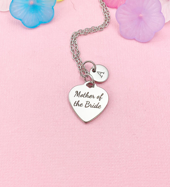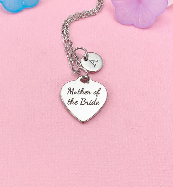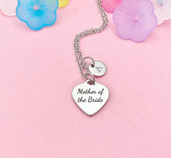 This is an engraving Mother of the Bride on stainless steel with hand stamp Initial charm on stainless-steel chain.