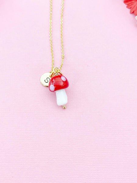 This is a gold tone Mushroom charm with hand stamped initial charm on brass/stainless steel 18 inches chain.