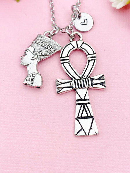 This is silver tone queen and cross charm with hand stamped initial charm on brass/stainless steel 18 inches chain.