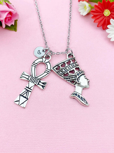 This is silver tone queen and cross charm with hand stamped initial charm on brass/stainless steel 18 inches chain.