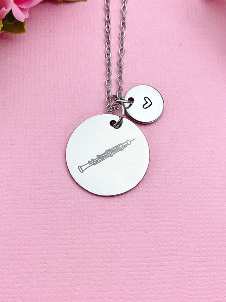 This is an engraving oboe and hand stamp initial charm on stainless steel necklace