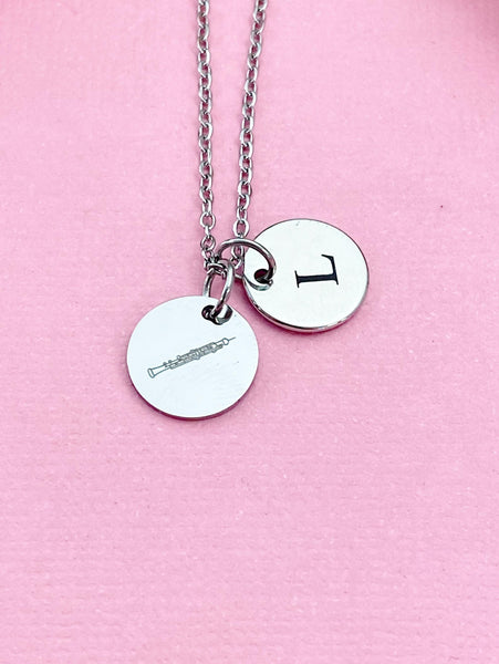This is an engraving oboe and initial on stainless steel charm on stainless steel necklace or key ring.