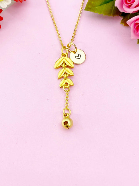 This is a gold tone olive leaf with bell charm with hand stamped initial charm on brass/stainless steel chain.