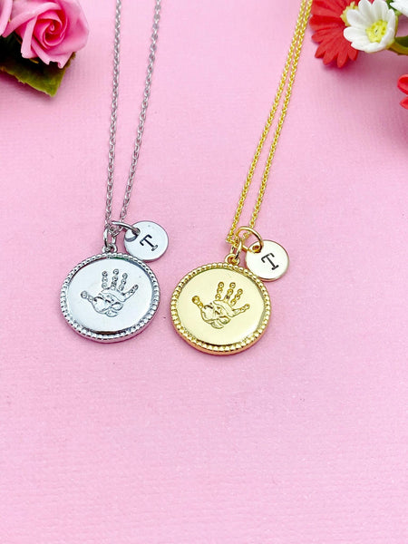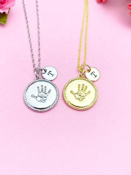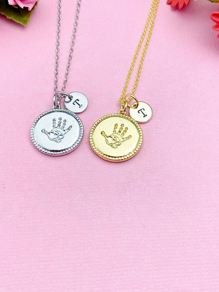 This is a gold-tone palm charm with hand stamped initial charm on brass/stainless steel 18 inches chain.