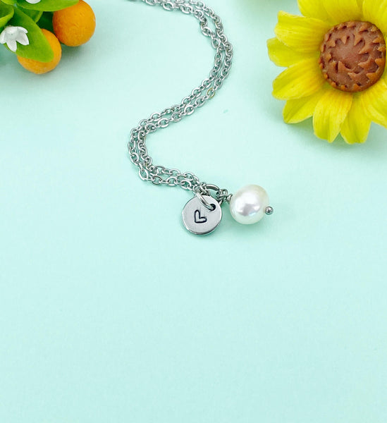 This is a silver or gold -tone freshwater pearl charm with hand stamped initial charm on brass or tarnish resistant stainless-steel chain.