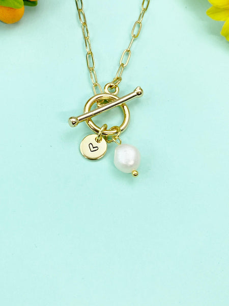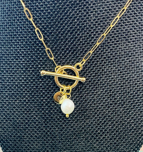 This is a gold or silver-tone Natural Pearl charm with hand stamped initial charm on brass or stainless steel 18 inches chain.