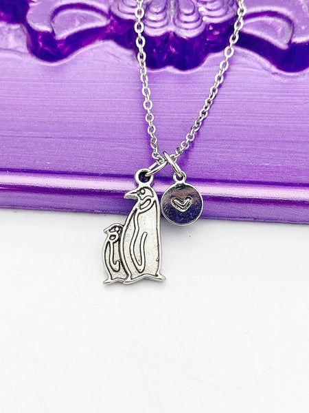 This is silver tone mother penguin and baby charm with hand stamped initial charm on brass/stainless steel 18 inches chain.