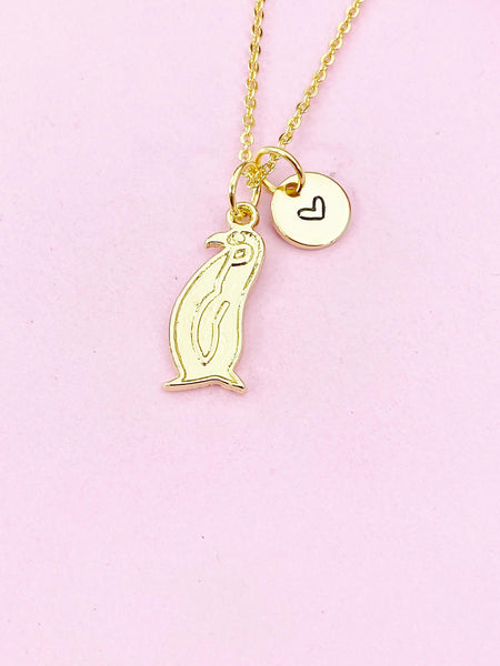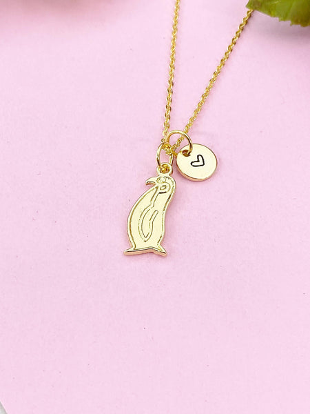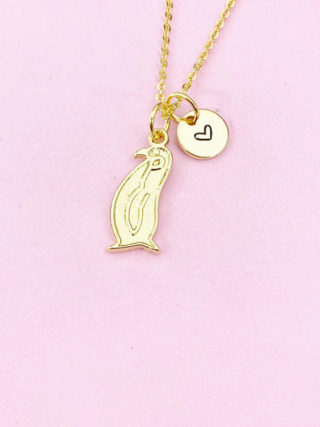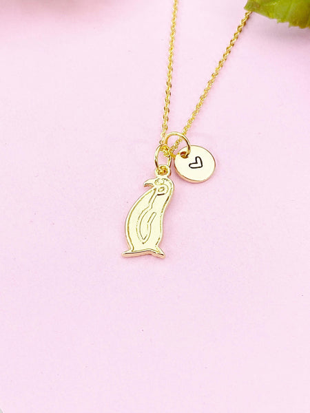 This is a gold tone Penguin charm with hand stamped initial charm on brass/stainless steel chain.