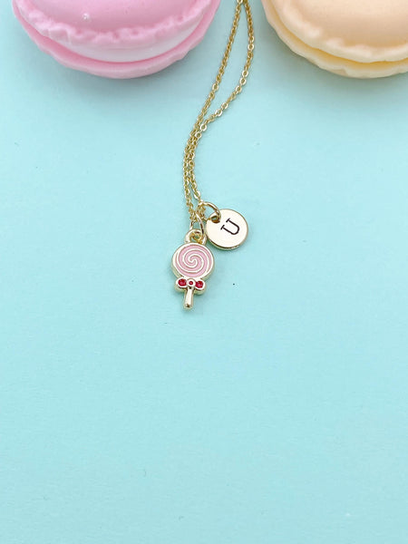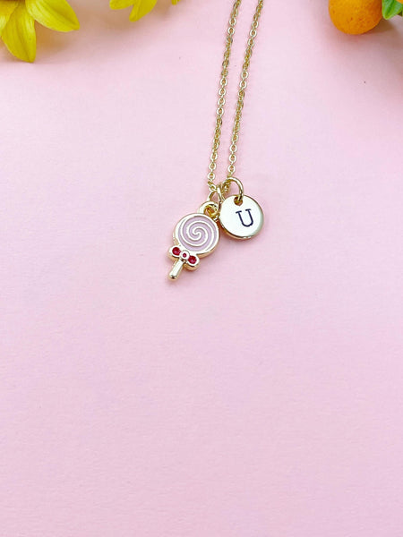 This is a gold -tone Pink Lollipop charm with hand stamped initial charm on brass/stainless steel 18 inches chain or bracelet or keyring.