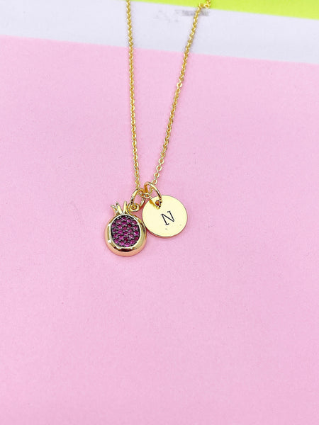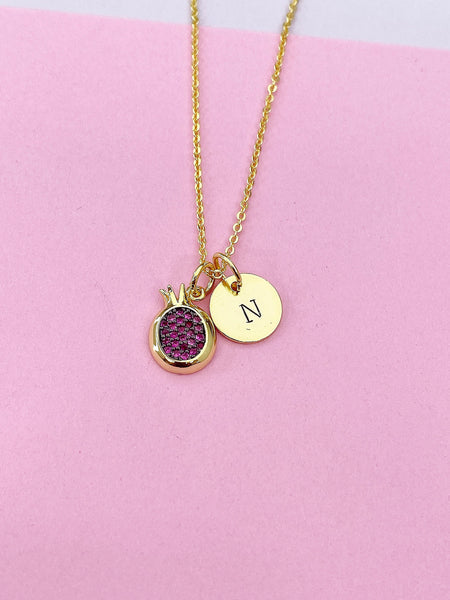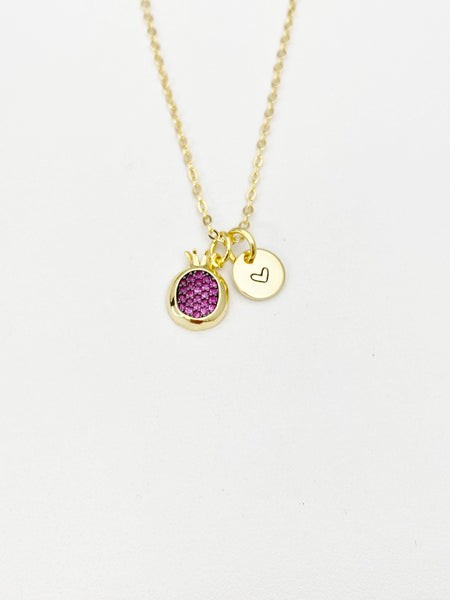 This is gold Pomegranate charm with hand stamped initial charm on brass/stainless steel chain.