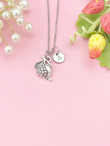 This is silver-tone alloy pomegranate charm with hand stamped initial charm stainless steel 18 inches chain or bracelet or keyring.