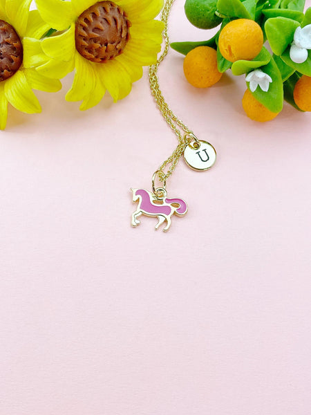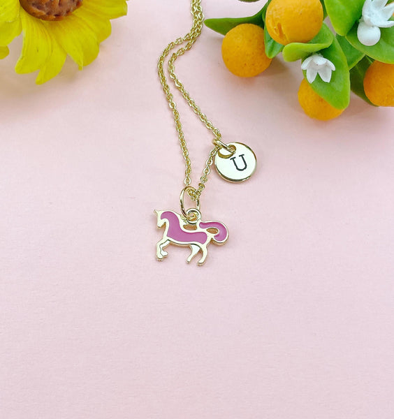 This is a gold -tone pony charm with hand stamped initial charm on brass/stainless steel 18 inches chain or bracelet or keyring.