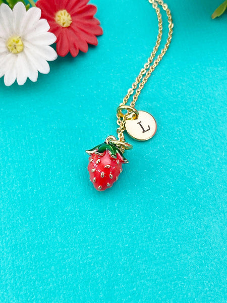 This is gold tone red strawberry charm with hand stamped initial charm on brass/stainless steel 18 inches chain.