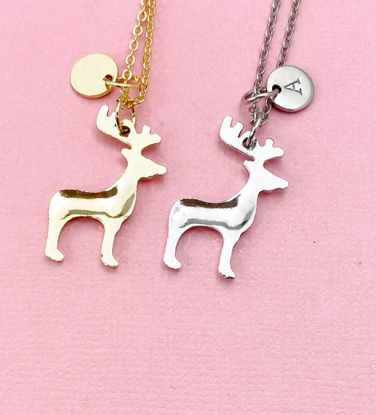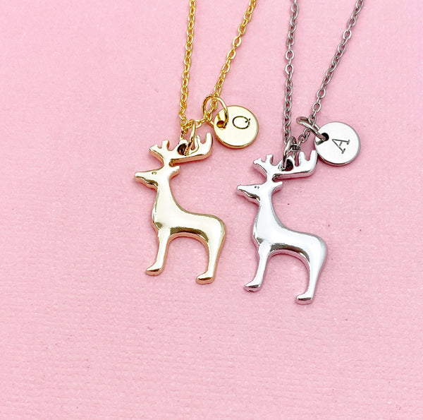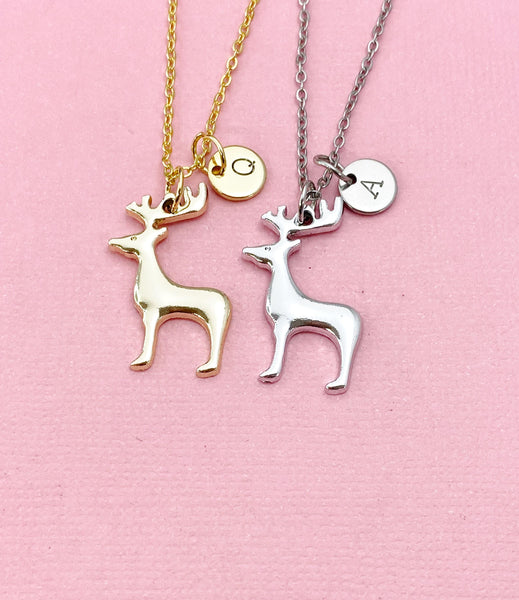 This is a gold or silver-tone deer charm with hand stamped initial charm on brass/stainless steel 18 inches chain.