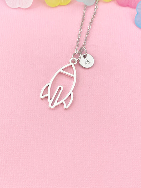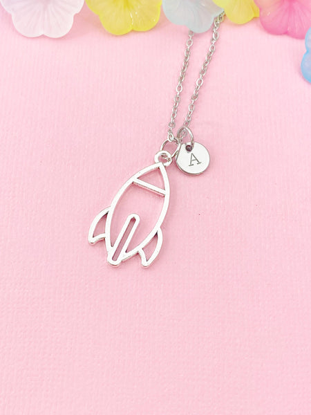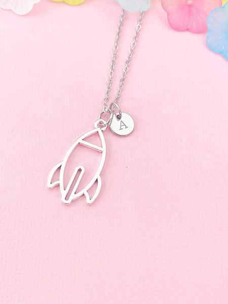This is a silver -tone rocket charm with hand stamped initial charm stainless steel 18 inches chain or bracelet or keyring.