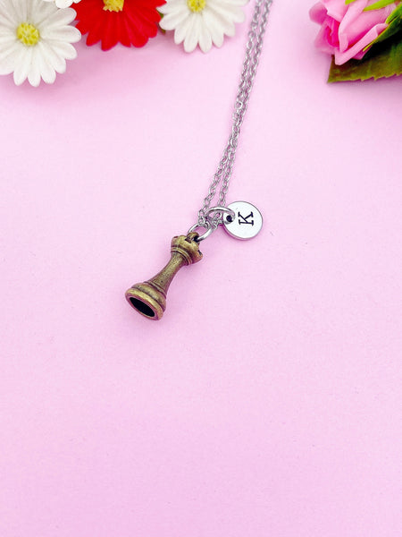 This is a bronze tone Rook Chess Pieces charm with hand stamped initial charm on a stainless-steel chain.