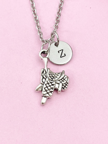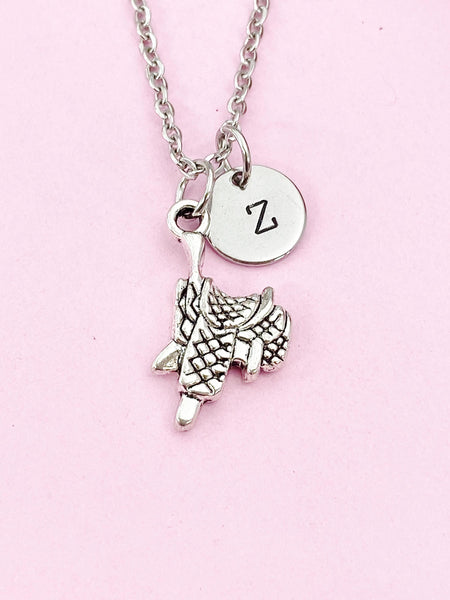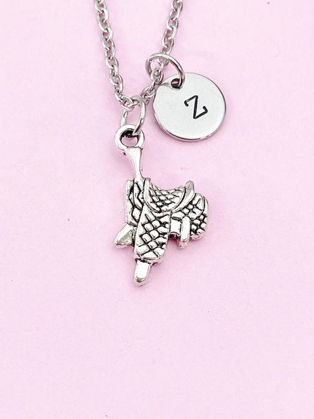 This is a silver tone saddle charm with hand stamped initial charm on brass/stainless steel chain.