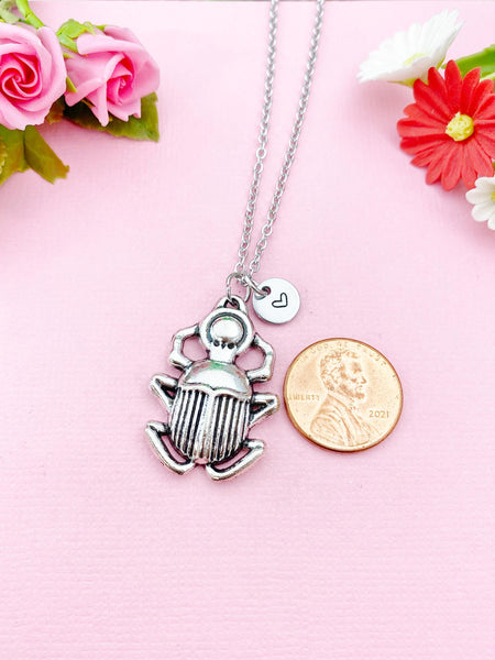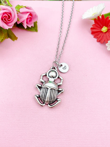 This is a silver -tone beetle scarab charm with hand stamped initial charm on brass or stainless-steel chain.