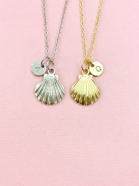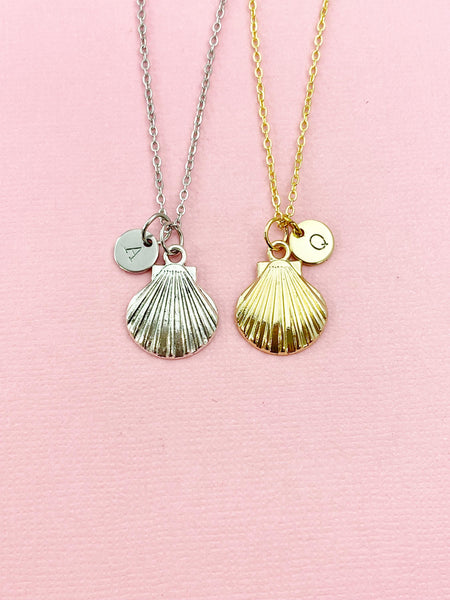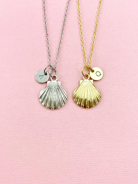 This is a gold or silver-tone shell charm with hand stamped initial charm on brass/stainless steel 18 inches chain.