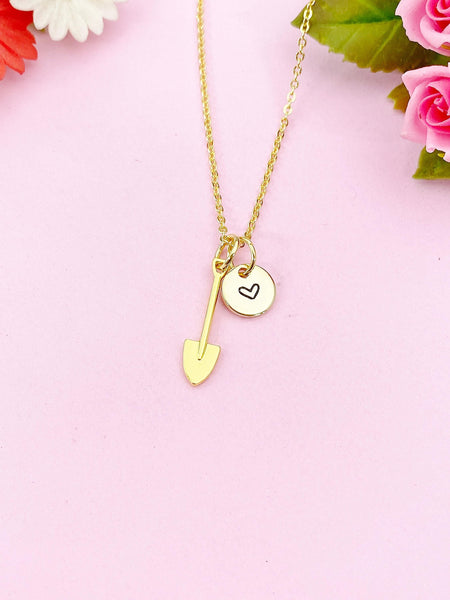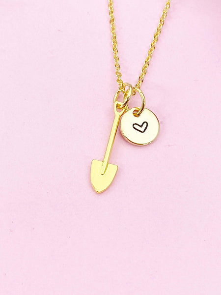 This is a gold or silver tone Shovel charm with hand stamped initial charm on brass/stainless steel chain.