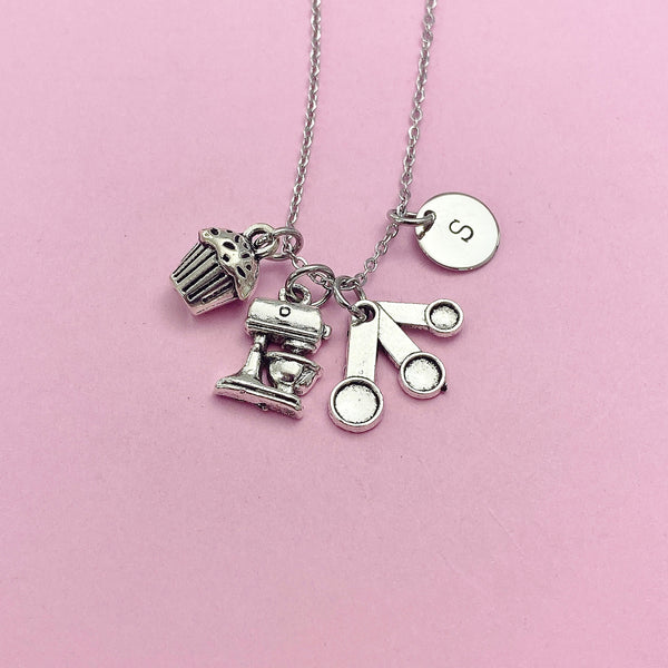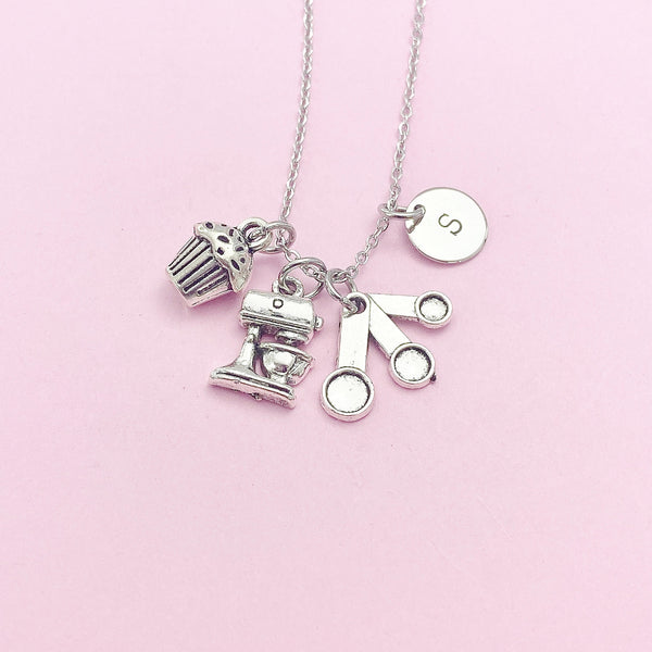 This is a silver-tone Kitchen Mixer Measuring Cup Cupcake charm with hand stamped initial charm on stainless steel necklace.