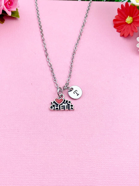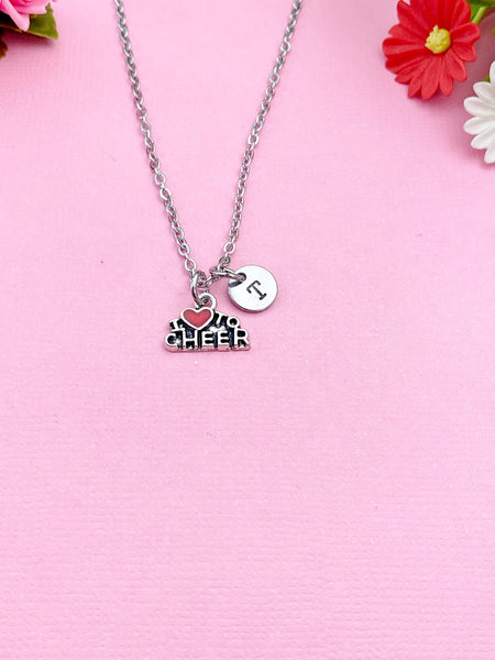 This is a silver-tone I heart to cheer charm with hand stamped initial charm on brass or stainless steel 18 inches chain.