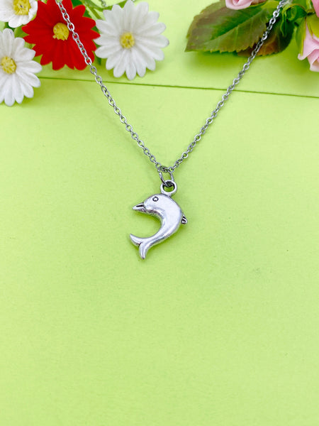 This is silver tone Dolphin charm with hand stamped initial charm on stainless steel 18 inches chain.