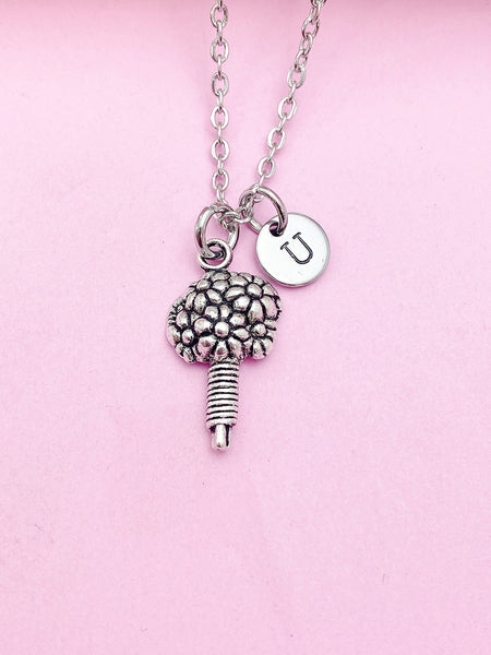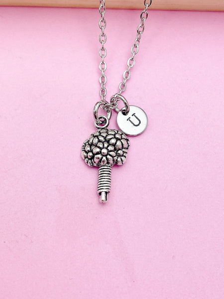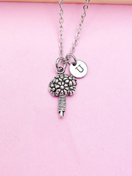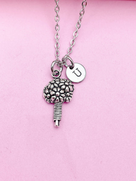This is a silver tone flower bouquet charm with hand stamped initial charm on stainless steel 18 inches chain.