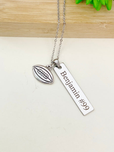 This is an engraving Name on stainless-steel and football charm with hand stamped initial charm on stainless steel necklace.
