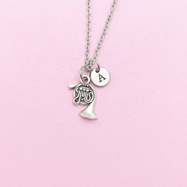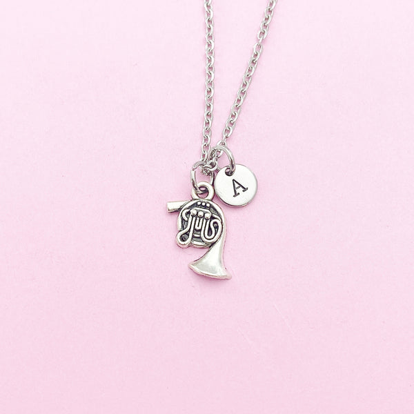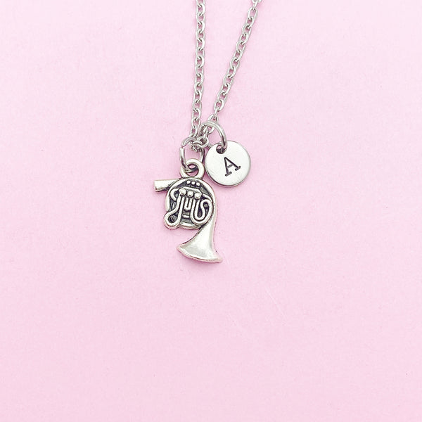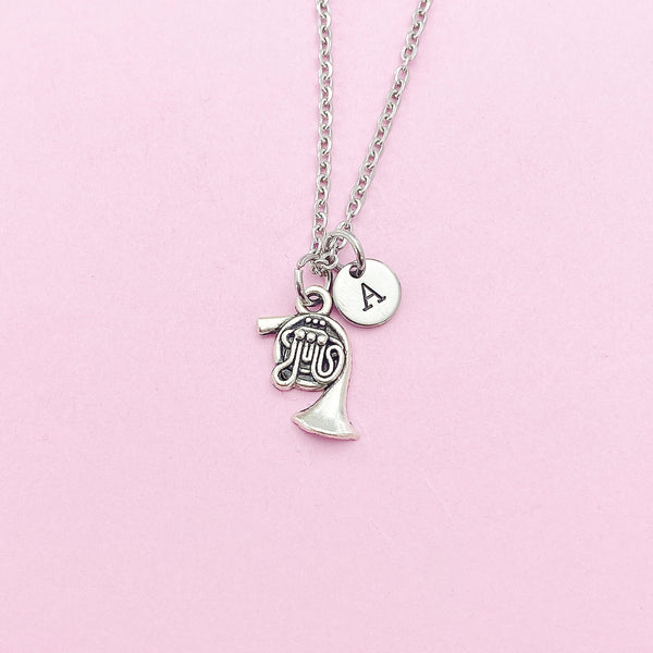 This is a silver-tone french horn charm with hand stamped initial charm on stainless steel necklace.