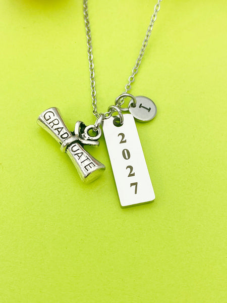 This is an engraving graduation year on stainless-steel tag with hand stamped initial charm and diploma charm on stainless steel bangle or necklace or split key ring optional.
