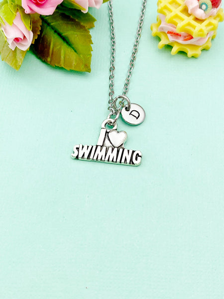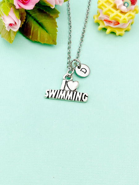 This is a silver-tone I Heart Swimming charm with hand stamped initial charm on tarnish resistant stainless steel 18 inches chain