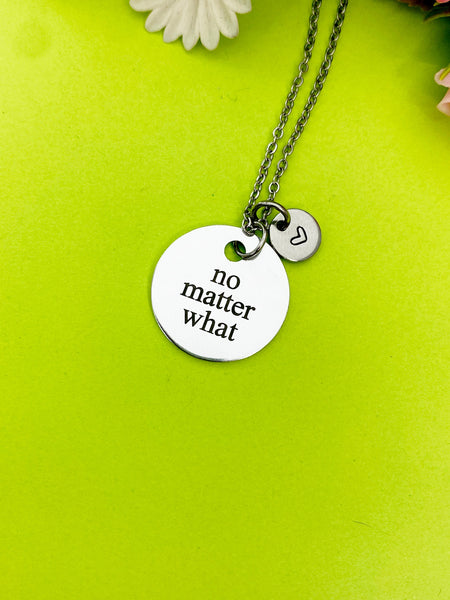 This is an engraving No Matter What or No Matter When or No Matter Where or No Matter Why on aluminum with hand stamped initial charm on stainless steel bangle or necklace or split key ring optional.