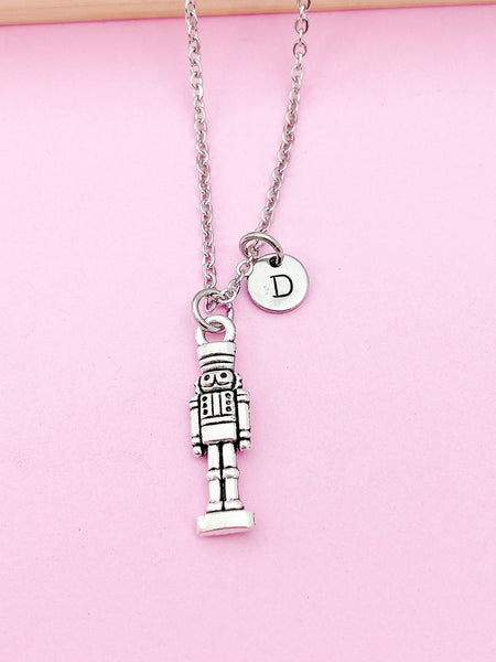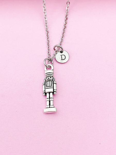 This is a silver tone soldier charm with hand stamped initial charm on stainless steel 18 inches chain.