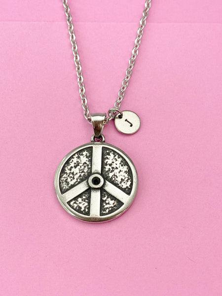This is Peace Sign Stainless Steel Pendants with hand stamped initial charm on tarnish resistant stainless-steel chain.