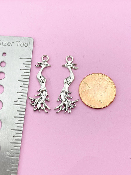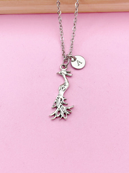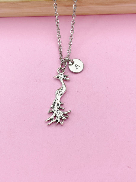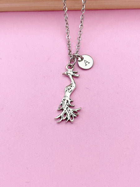 This is a silver-tone phoenix charm with hand stamped initial charm on brass or tarnish resistant stainless-steel chain.