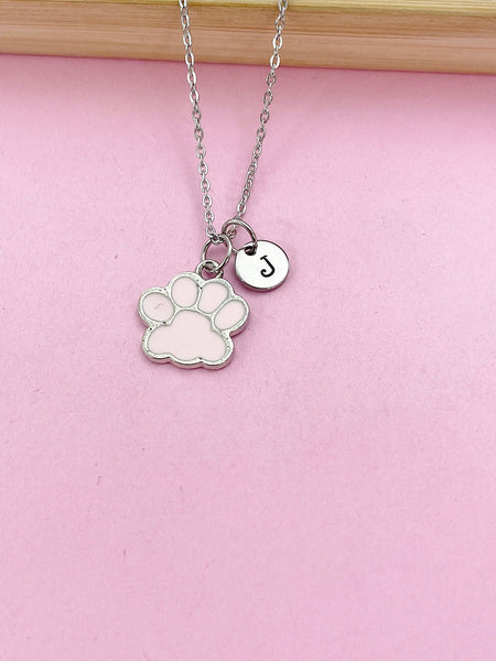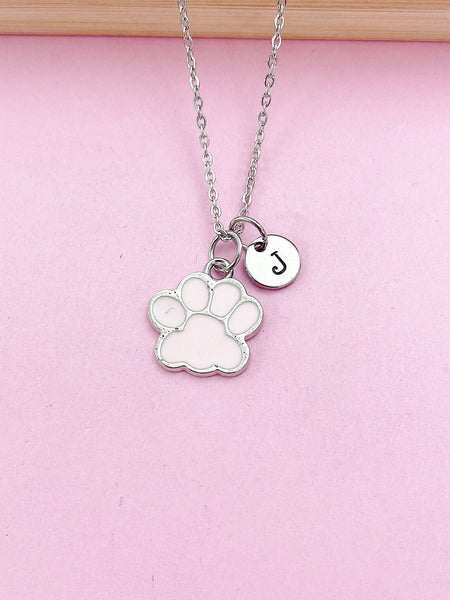 This is a silver tone Dog Paw Prints charm with hand stamped initial charm on stainless steel 18 inches chain.