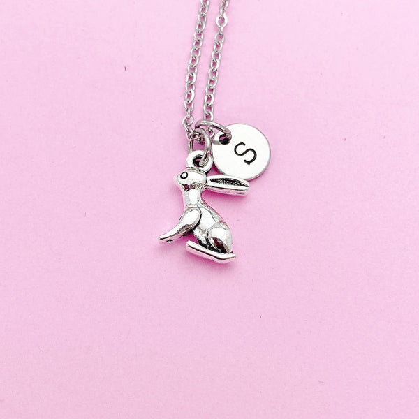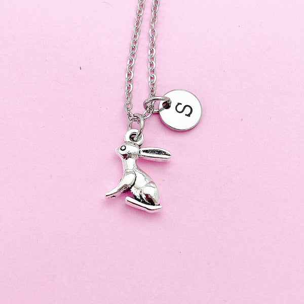 This is a silver-tone rabbit charm with hand stamped initial charm on brass or stainless-steel chain.