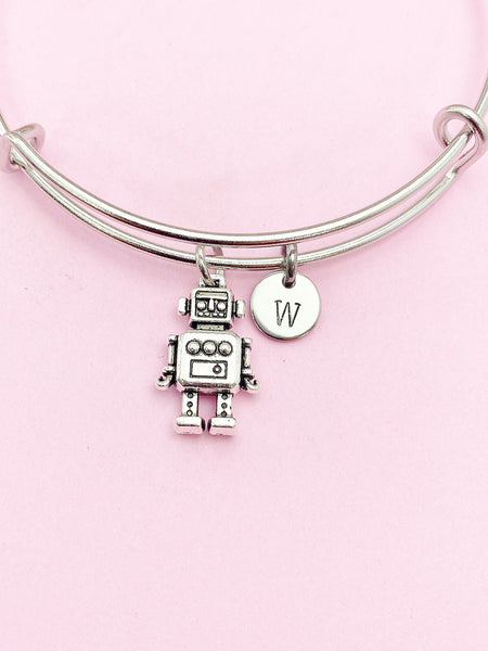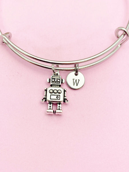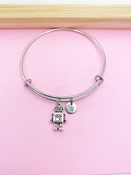 This is a silver-tone robot charm with hand stamped initial charm on stainless steel bracelet bangle.