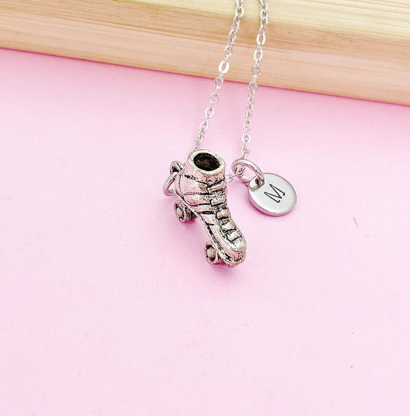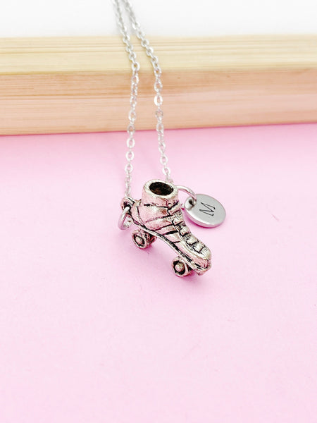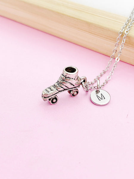 This is a silver-tone roller skate charm with hand stamped initial charm on brass or stainless steel chain.