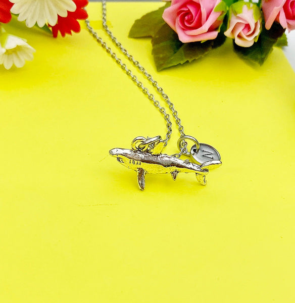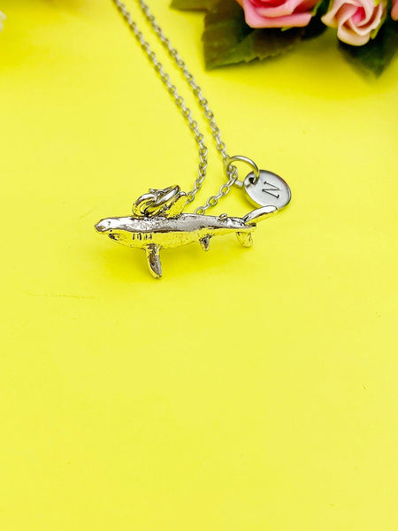 This is silver tone shark charm with hand stamped initial charm on brass/stainless steel 18 inches chain.