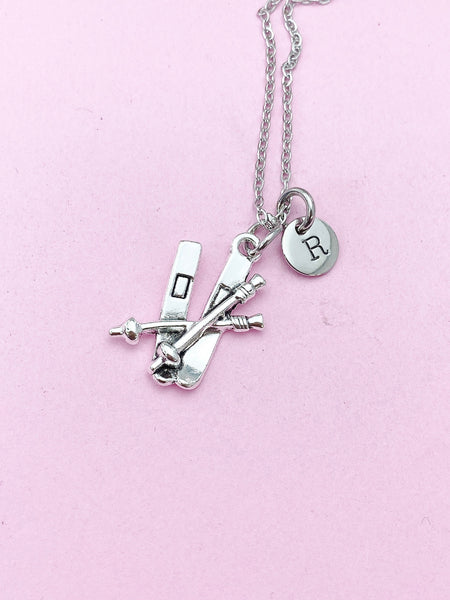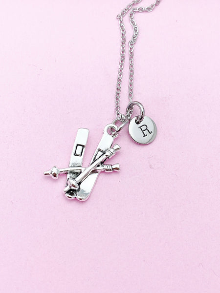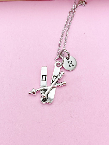 This is a silver-tone ski charm with hand stamped initial charm on brass or tarnish resistant stainless-steel chain.