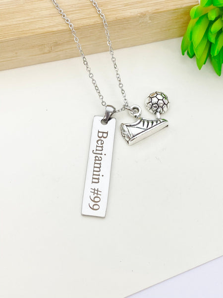This is an engraving Name on stainless-steel and soccer charm with hand stamped initial charm on stainless steel necklace.