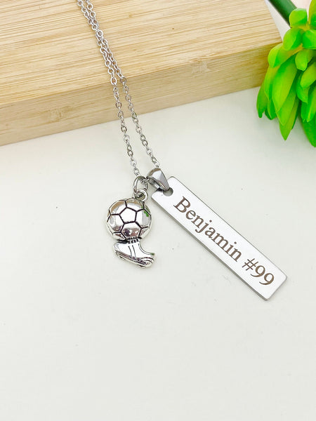 This is an engraving Name on stainless-steel and soccer charm with hand stamped initial charm on stainless steel necklace.