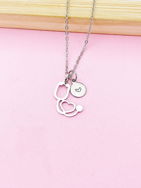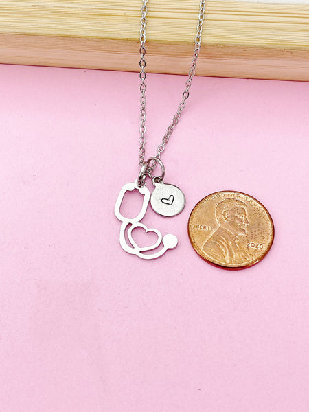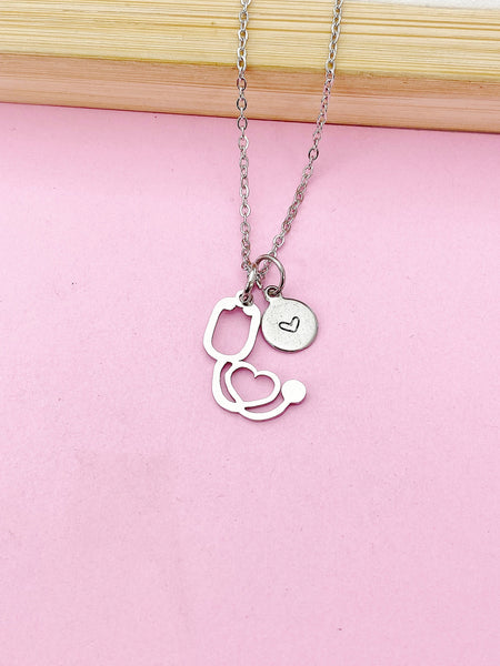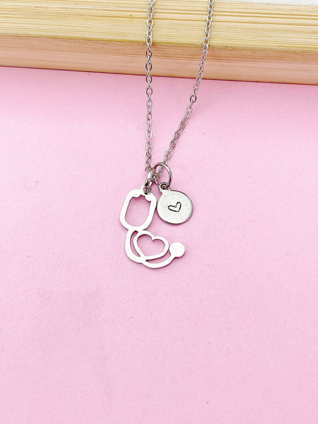 This is a stainless-steel silver-tone stethoscope charm with hand stamped initial charm on stainless steel necklace.