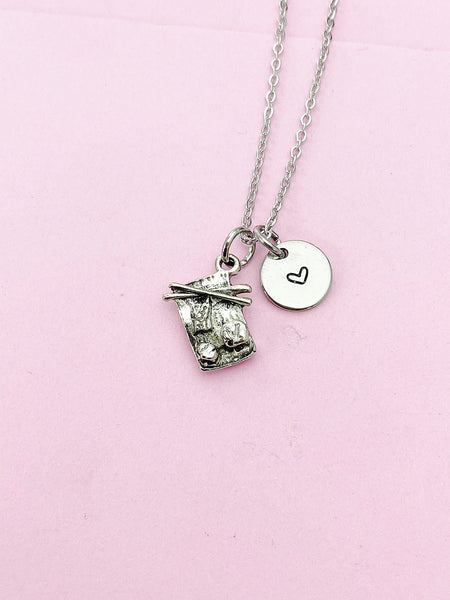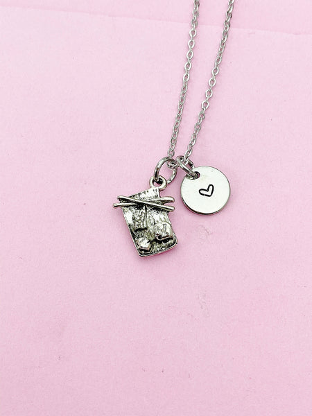 This is a silver-tone sushi charm with hand stamped initial charm on stainless steel 18 inches chain.
