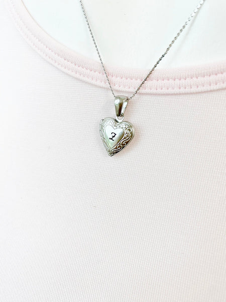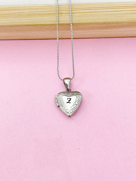 This is a unique engraving initial on stainless steel or brass heart locket charm on 18 inches stainless steel necklace chain.