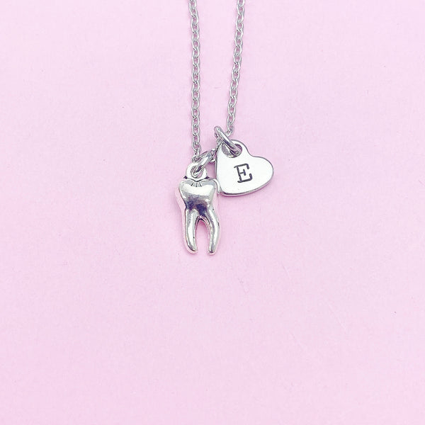 This is silver tone tooth charm with hand stamped initial charm on brass/stainless steel 18 inches chain.